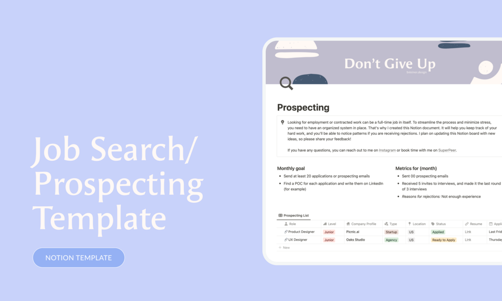 Looking for employment or contracted work can be a full-time job in itself. To streamline the process and minimize stress, you need to have an organized system in place. That's why I created this Notion document. It will help you keep track of your hard work, and you'll be able to notice patterns if you are receiving rejections. I plan on updating this Notion board with new ideas, so let me know if you want to be update!